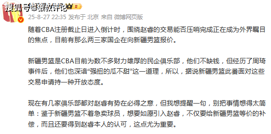 根据媒体人付政浩的报道,围绕赵睿的交易能否压哨完成正在成为外界瞩目的焦点,目前有那么两三家国企在向新疆男篮报价。